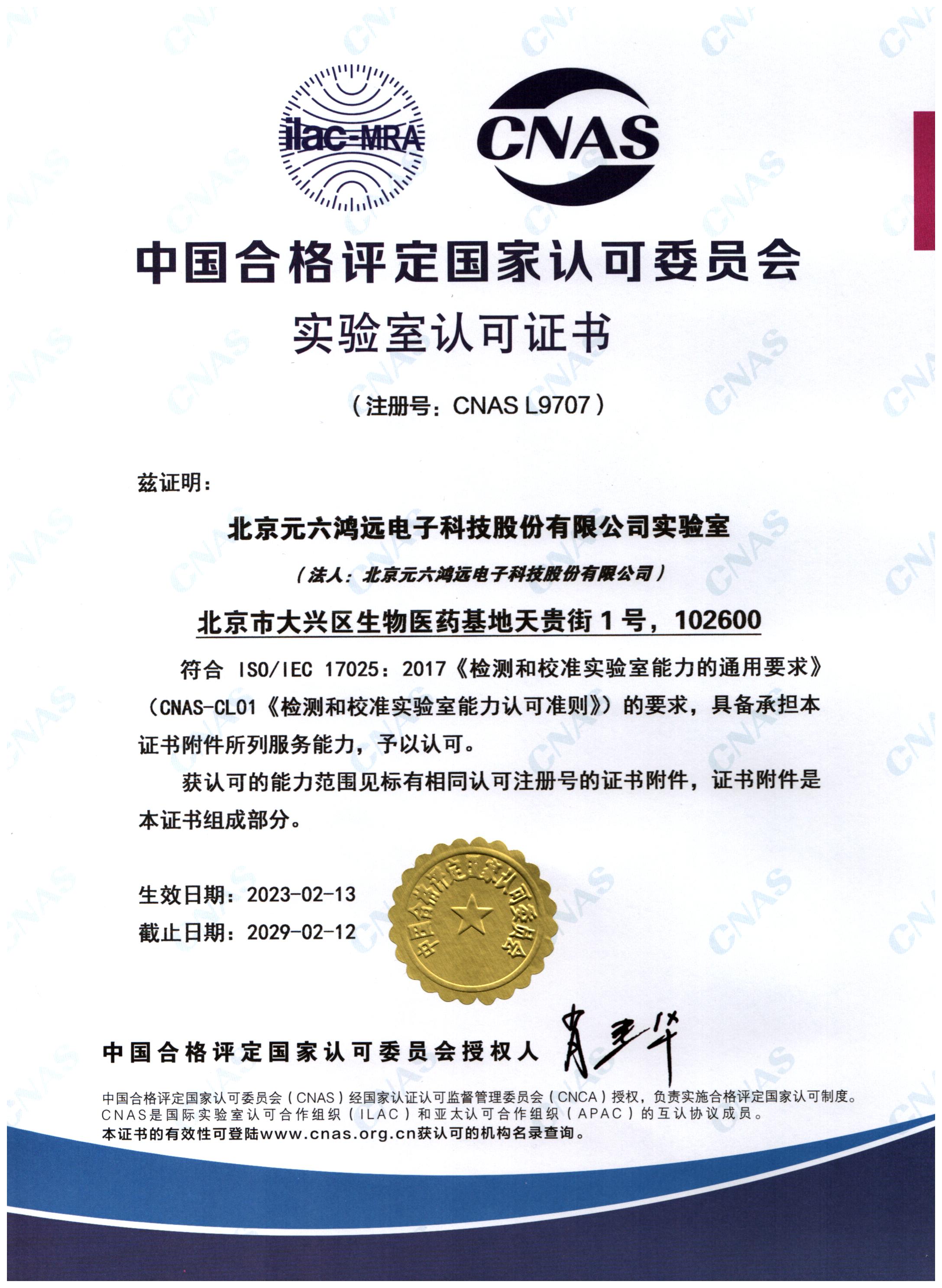 CNAS实验室认可证书(中文版)